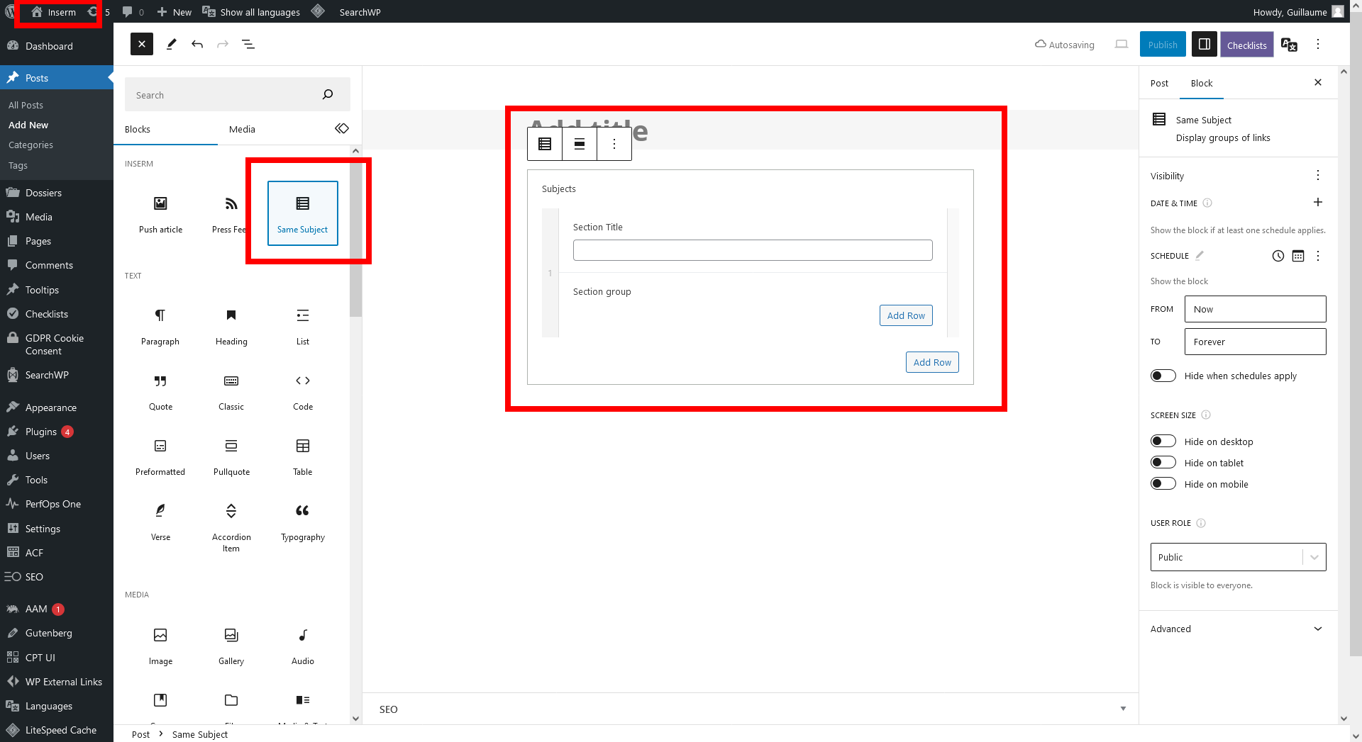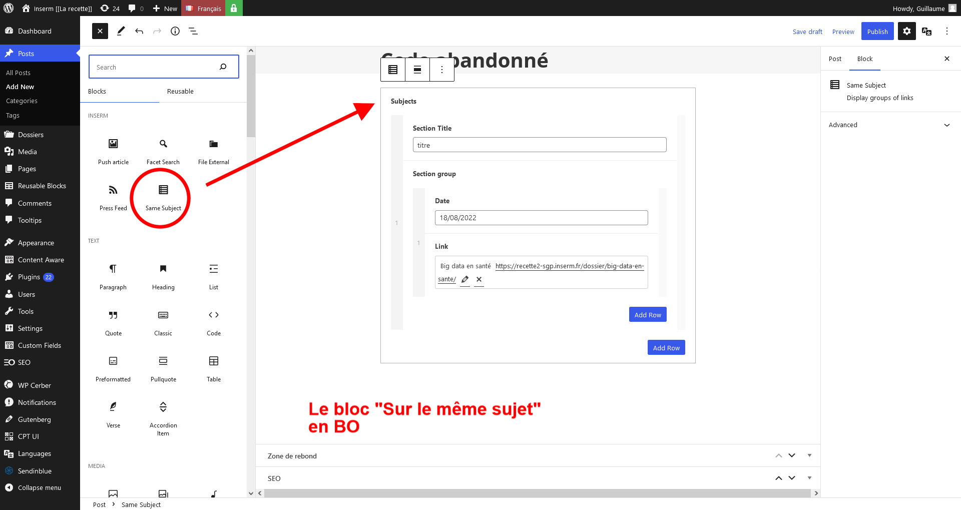 Pendant le projet V6, on a imaginé un bloc Gutenberg custom "Sur le même sujet", puis on a abandonné le projet alors qu'il était déjà développé.