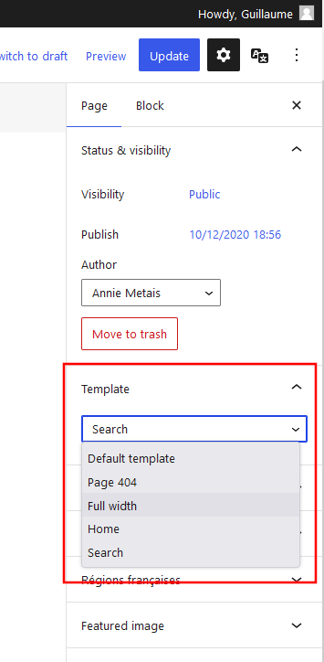 Par défaut, une Page utilise le template page.php. Mais on peut choisir d'appeler un template custom depuis le BO (voir PJ).
