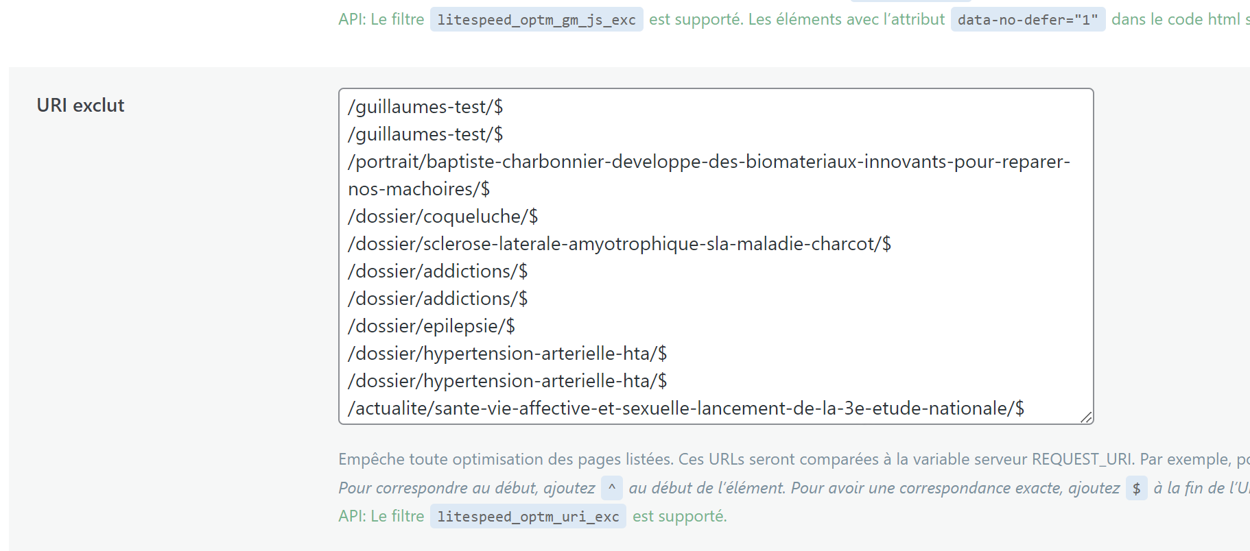 Litespeed cache / Optimisation de page -> onglet [8] Personnalisation URI exclut